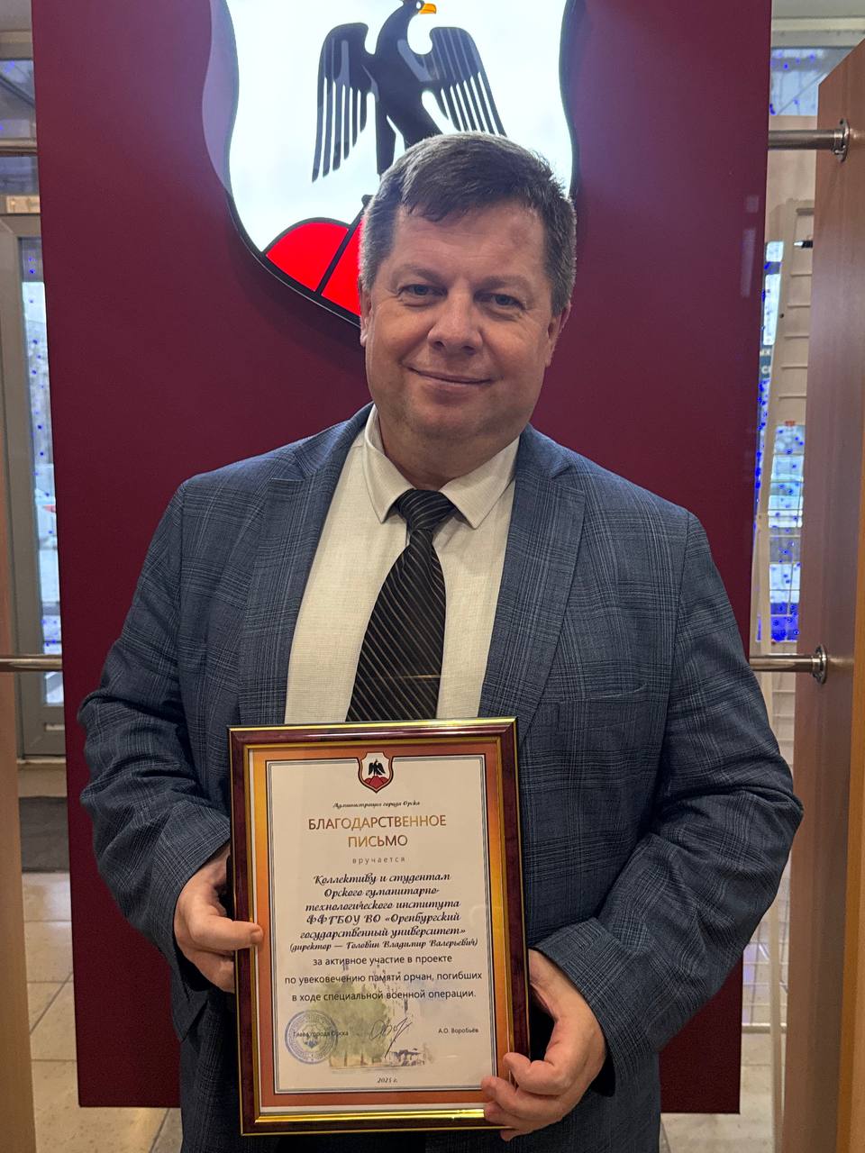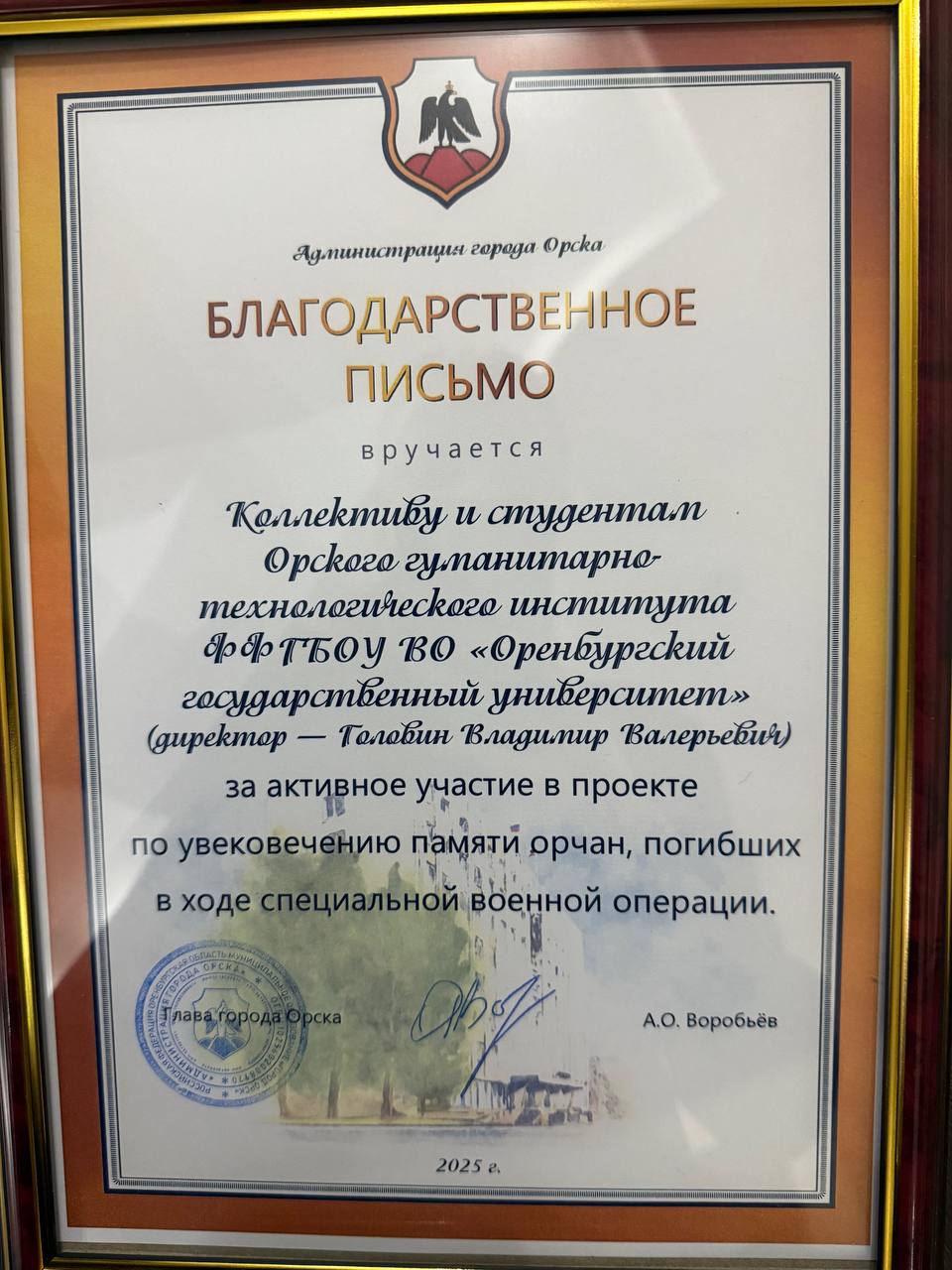 Благодарственное письмо вручено коллективу и студентам Орского гуманитарно-технологического института (филиала) ОГУ за активное участие в проекте по увековечению памяти орчан, погибших в ходе специальной военной операции.